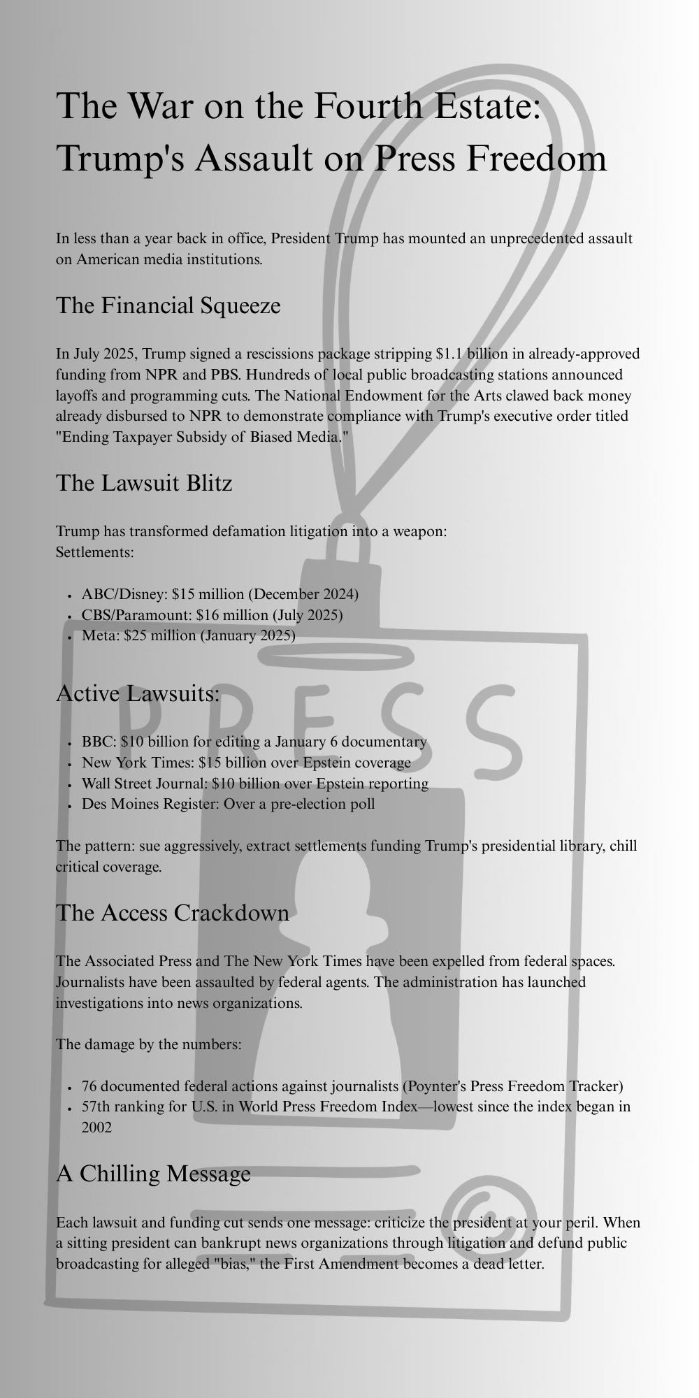 What unites the Bezos, Soon-Shiong, and Ellison capitulations is their bad faith. All three involved owners with massive business interests vulnerable to government pressure. All three happened in election season or shortly after. All three were dressed up as high principle—”avoiding bias,” “letting readers decide,” “needing more reporting”—while being transparently about protecting bottom lines.
