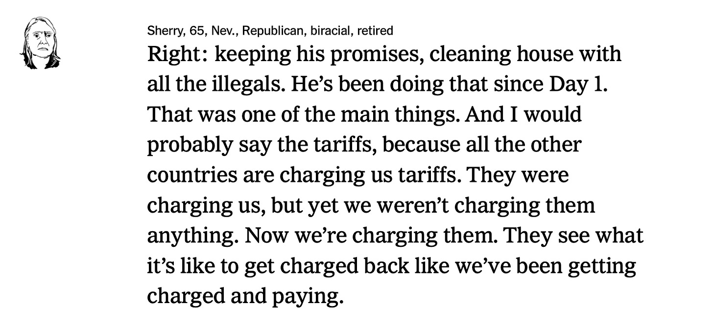 The tariffs these same focus groupers cheered have jacked up consumer prices by 17 percent on imported goods. The average American household is paying $1,900 more per year. But the vibes say prosperity, so prosperity it is.