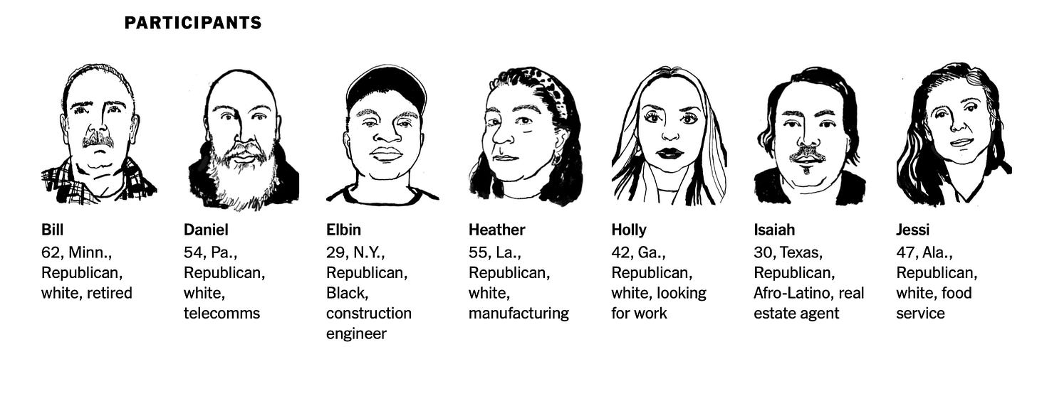 I left a comment on this focus group in a related NYT opinion piece: ‘Bad, Bad News for the G.O.P. Over the Long Haul’ but the Times deleted it from the roll of comments it publishes in the sidebar. I guess my use of the word "idiots" didn't sit well with the gatekeepers. Or maybe it was the words "obtuse" or "willingly mis/uninformed." Maybe they didn't like the suggestion that the focus group members were incapable of thinking more than a week, quarter, or year out to any consequences or unhappy corellations. In this case intended consequences are just as bad as unintended consequences. Thanks for bringing attention to this terrifying fact amongst the populace. There are plenty of people who remain fully on board with the madness. I confirm the same with the MAGA folks I know. They're all in, no matter.