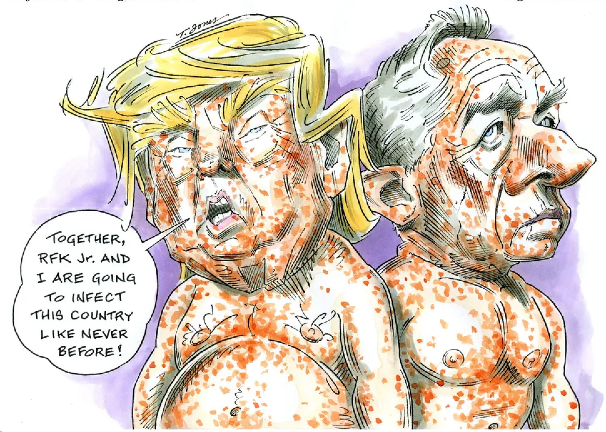 The U.S. measles outbreak has now exploded beyond last year's total, revealing the catastrophic consequences when a self-centered geriatric sociopath occupying the Oval Office appoints Robert F. Kennedy Jr. – a man whose only "qualifications" are his famous last name and history of promoting thoroughly debunked conspiracy theories – to oversee the nation's health.