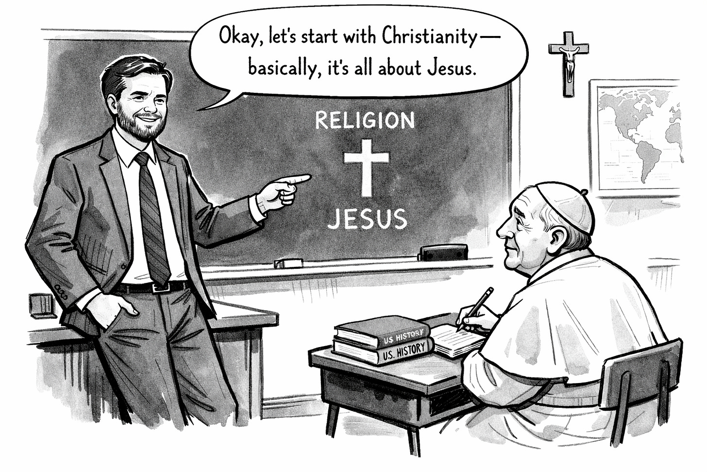 The deeper problem is theological, in its way. There exists a particular species of new convert who arrives at faith the way certain people discover intermittent fasting: loudly, completely, and with an evangelical certainty that they now understand something the rest of us have been getting wrong. They confuse the intensity of their arrival with the depth of their comprehension. Vance is this person. His Catholicism is not a private conviction quietly held. It is a credential, a cudgel, a brand extension. I converted, therefore I may grade the Pope’s doctrinal accuracy. By this logic, every bewildered six-year-old who survived First Communion in South Boston is qualified to edit the Catechism. The Pope, to his considerable credit, does not appear to have been briefed on Vance’s theological authority.