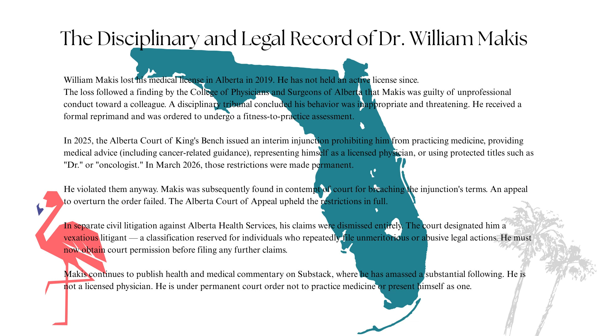 Makis, predictably, characterized the injunction as persecution. He blamed Alberta Premier Danielle Smith. And then he announced he was applying for a Florida medical license. Florida’s Board of Medicine issued a notice of intent to approve his licensure with conditions. This is not a surprise. It is almost a perfect outcome for a man who has spent years exploiting the gap between what the rules say and what the rules do.