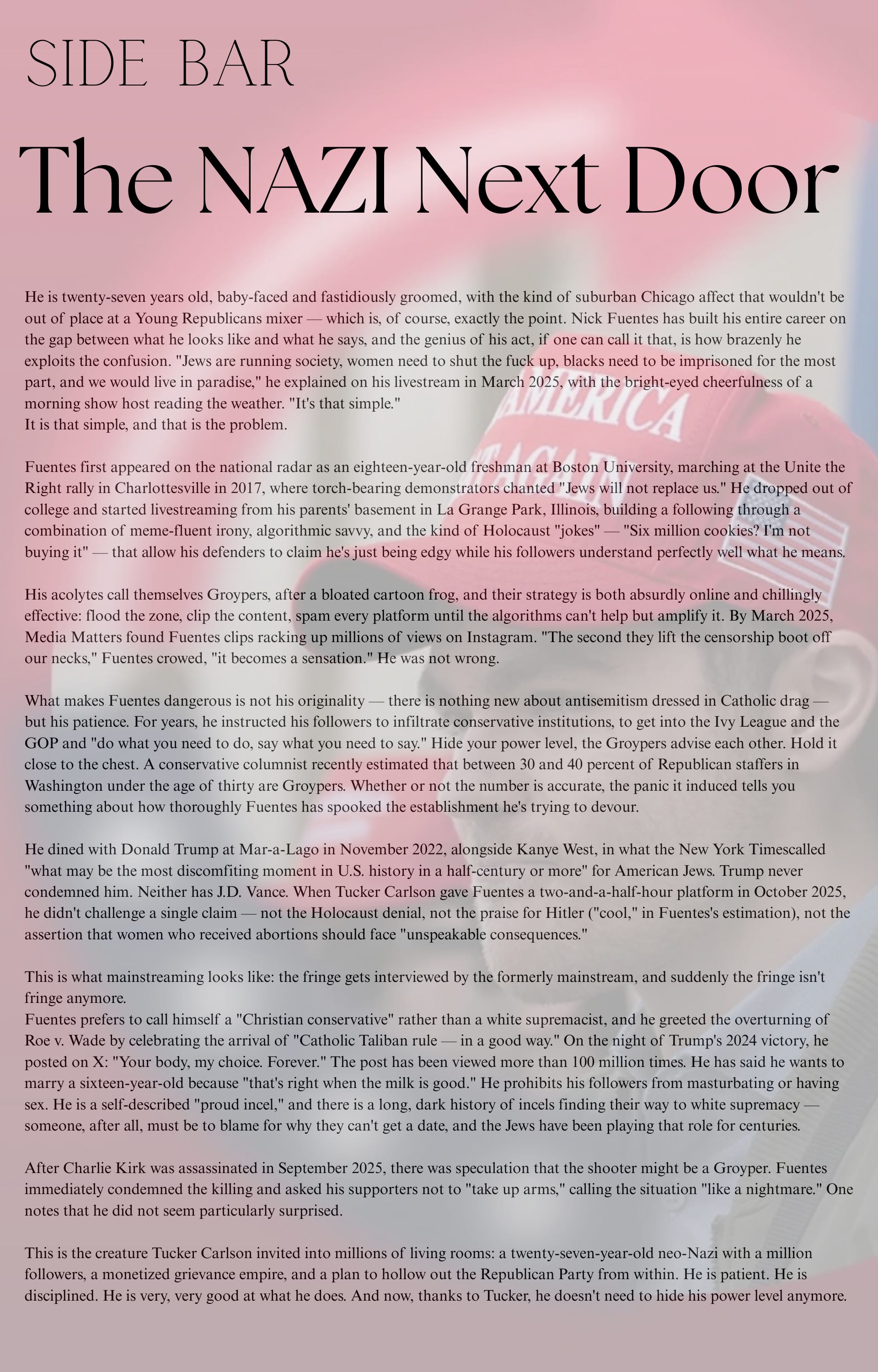 This is the essential thing to understand about Trump 2.0: the guardrails are gone because the people who once manned them have discovered there is more profit in arson. The Heritage Foundation — that once-staid temple of Reagan-era conservatism, the institution that gave us welfare reform and tax cuts — has rallied to Tucker’s defense after the Fuentes interview. Kevin Roberts, its president, called Tucker “a close friend” and declared that Heritage wouldn’t “cancel our own people.” Ted Cruz and Mitch McConnell, perhaps smelling the sulfur, issued condemnations — but softly, softly, because one doesn’t want to alienate the base. And what is the base now? It is the people who watch Tucker tell Peter Brimelow that whites are being “eliminated” and nod along. It is the people who see Renée Good’s name and think she had it coming. It is the people who launched a GoFundMe for Jonathan Ross, the ICE agent who killed her, and raised $375,000 — one of the fundraisers explicitly blaming “anti-American traitors like Minneapolis Mayor Jacob Frey (who is Jewish)” for “fanning the flames of resistance.” (Note the parenthetical. Note it always.) This is where the rage goes. It goes into chat rooms and podcasts and streaming shows watched by millions. It marinates in replacement theory and white grievance and the certainty that someone is to blame for the fact that America doesn’t feel the way it’s supposed to feel. And then it straps on a badge and goes to Minneapolis, where it fires twelve times at civilians in the space of a few months, killing two of them — both 37, both American citizens, both unarmed in any meaningful sense when the bullets entered their bodies. Chris Madel, a Republican lawyer who had been planning to run for governor of Minnesota, withdrew from the race after Alex Pretti’s killing. He had previously represented Jonathan Ross. “I cannot support the Republican party for what he called retribution,” his statement read. He blamed national Republicans for making it “nearly impossible for a Republican to win a statewide election in Minnesota.” One notes that his objection is strategic rather than moral. One notes that this is the best we’re going to get from that quarter.