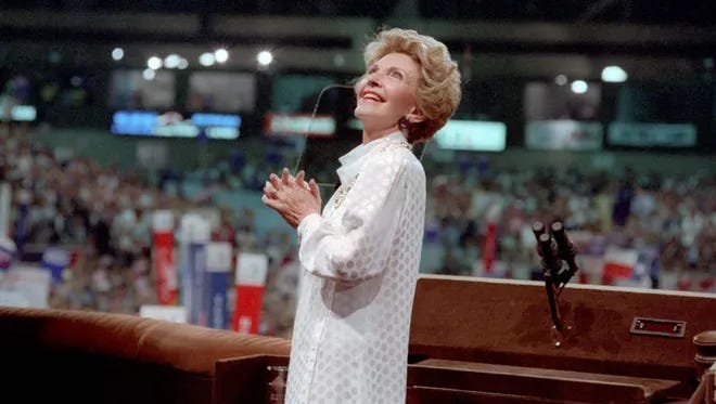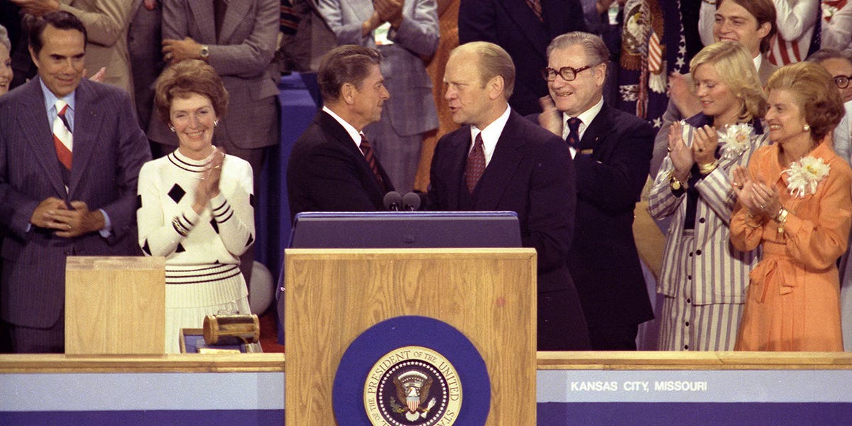 Picture Ronald Wilson Reagan in 1976, standing at the podium of the Republican National Convention in Kansas City, having just lost the nomination to Gerald Ford by a whisker. The house lights catch the Brylcreem in his hair, that architectural marvel of male vanity that wouldn’t move in a hurricane. He’s sixty-five years old, ancient by political standards, but the makeup and lighting—always the makeup and lighting with Reagan—make him look like a mature leading man, which is exactly what he was.
