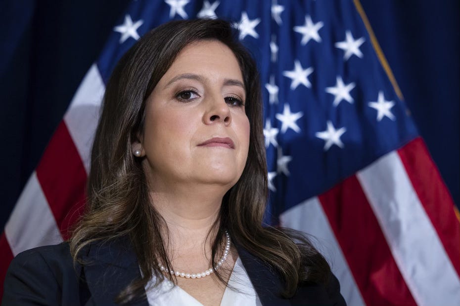 Even Elise Stefanik, who transformed from moderate Republican to Trump junk-yard dog with the speed of a fat bride’s maid at 44, catching the bouquet, has announced she’s running for governor of New York. Never mind that she was booed off the stage twice in her own district, with constituents shouting “Shame!” and “Go home!” Never mind that Trump lost New York by 13 points. She’s calculating her escape route before the locals bring out the tar and feathers.