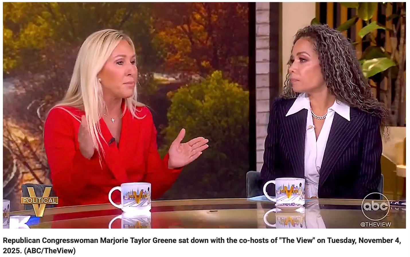 Enter Marjorie Taylor Greene, she of the Jewish space laser theory, suddenly sounding like the voice of reason on “The View.” I nearly choked on my morning cappuccino. There she was, calling the shutdown “an embarrassment,” praising Nancy Pelosi—Nancy Pelosi!—and warning about economic illiteracy in the GOP. Wolf Blitzer looked as though someone had slipped peyote into his green room coffee. What happened? Did she finally hire a pollster? Find a psychiatrist? Or is she simply smart enough to know that when the ship goes down, it’s best to be wearing a life jacket with “2028” embroidered on the front?