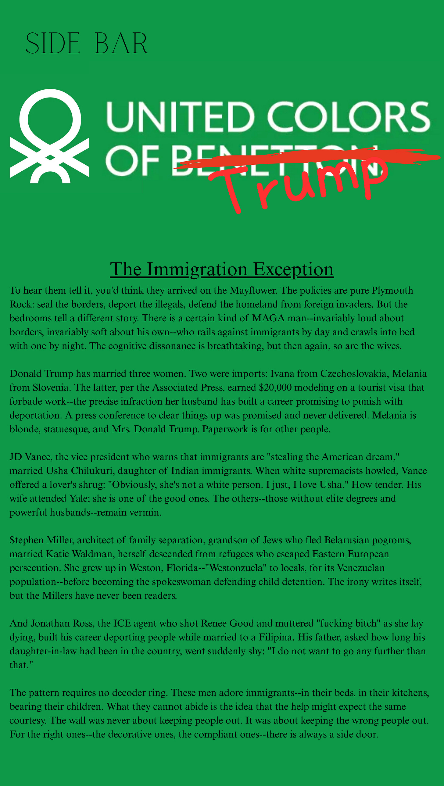 There is one more detail that deserves attention, one more thread in a story already dense with irony. Jonathan Ross’s wife is an immigrant. Her parents are doctors who still live in the Philippines. She and Ross married in 2012, when he was still working for the Border Patrol in El Paso; on her Instagram, she once posted a photograph of herself posing next to a U.S. Border Patrol helicopter. When the Daily Mail asked Ed Ross how long his daughter-in-law had been in the United States, he demurred: “I do not want to go any further than that.” The irony writes itself--a man who spent a decade enforcing immigration law with what appears to be considerable enthusiasm, who flew the flag of a movement built on nativist rage, married to a woman whose own family crossed an ocean to reach this country--but perhaps irony is not quite the right word. Perhaps this is simply the way the system has always worked for men like Ross, the unspoken exception that proves the rule. The border is sacred, except when it isn’t. The immigrant is a threat, except when she is your wife. The law must be enforced with maximum violence against them, but the people you love will always be one of us. This is the through-line of Trumpism, the belief that hierarchy is natural and inevitable, that some people are simply worth more than others, that the role of power is to protect those who matter from those who don’t. Jonathan Ross knows, in his bones, who matters and who doesn’t. He knows which immigrants are acceptable and which are “poisoning the blood.” He knows which lives are precious and which can be ended with three quick shots and a muttered obscenity. The flags told him. The stickers told him. The president he supported told him. And on January 7th, he acted on what he had learned.