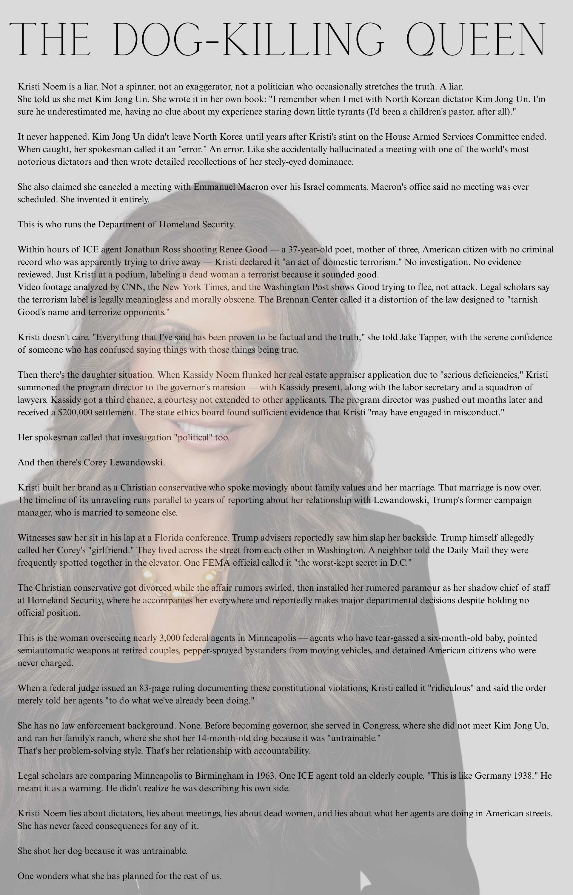 When you belong to a church that teaches homosexuality is “sinful and offensive to God,” when you lead an agency conducting the most aggressive immigration crackdown in American history, when you descend from a tradition that blessed slavery and made common cause with the Klan—what do you see when you look at a lesbian legal observer standing between your agents and their targets? You see a sinner. You see an obstruction. You see someone the Bible has already told you is offensive to God, someone whose very existence violates divine order. The theology does the work for you. It has been doing that work for 180 years, marking certain people as less than human, as outside God’s protection, as obstacles to be removed.