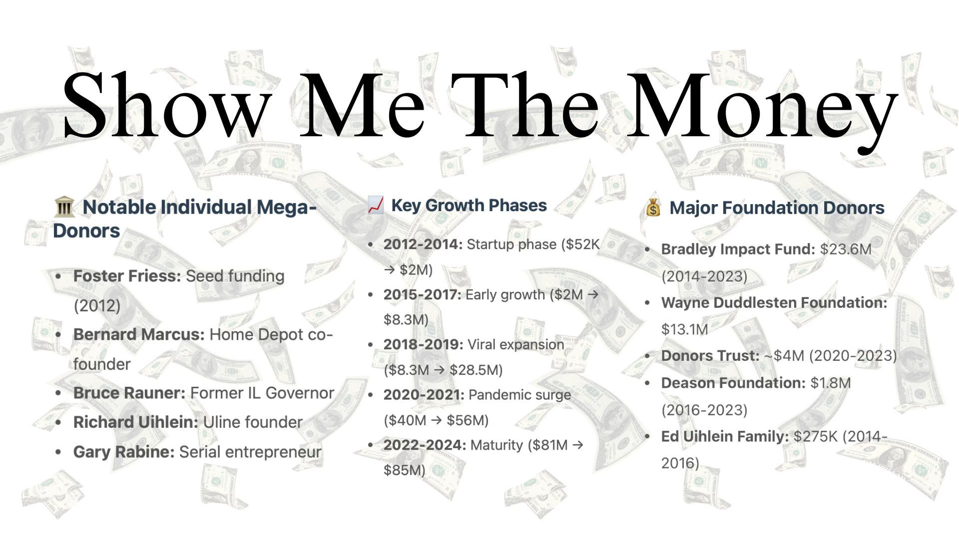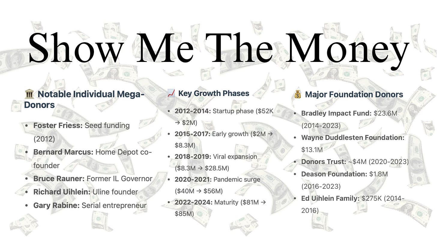 Other notable donors: Thomas W. Smith Foundation ($400,000), the DeVos family (yes, Betsy DeVos’s in-laws), Bruce Rauner (former Illinois governor, $150,000), Jack Roth’s foundation ($8.7 million), Dean Buntrock of Waste Management ($4.1 million). Each represents old money protecting its interests by radicalizing the young.