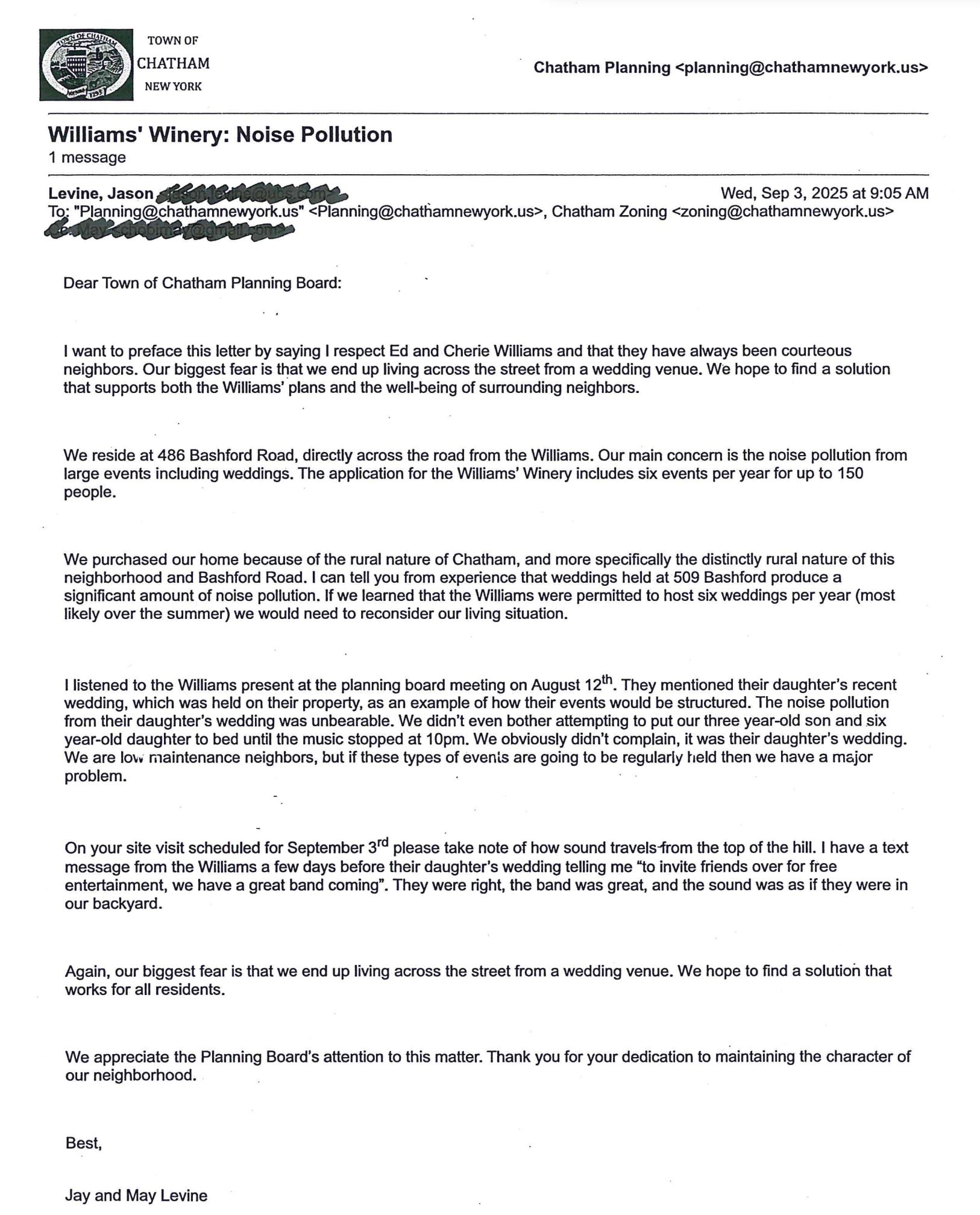Is it fair? Sit with that for a second. Is it fair that the residents of Bashford Road might have their lives, property, and peace of mind upended because Edwin Williams III and his wife Cherie want to throw weddings and sell wine?