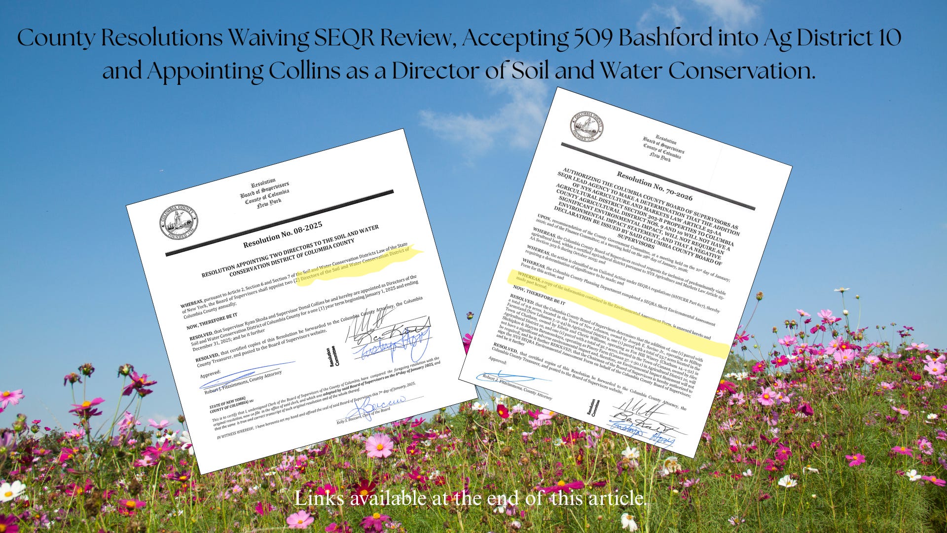 There's more. Consider it the cherry on this particular irony sundae — and it does not appear anywhere in the Chatham Town record: in January 2025, Collins was appointed to Columbia County's Soil and Water Conservation District committee.