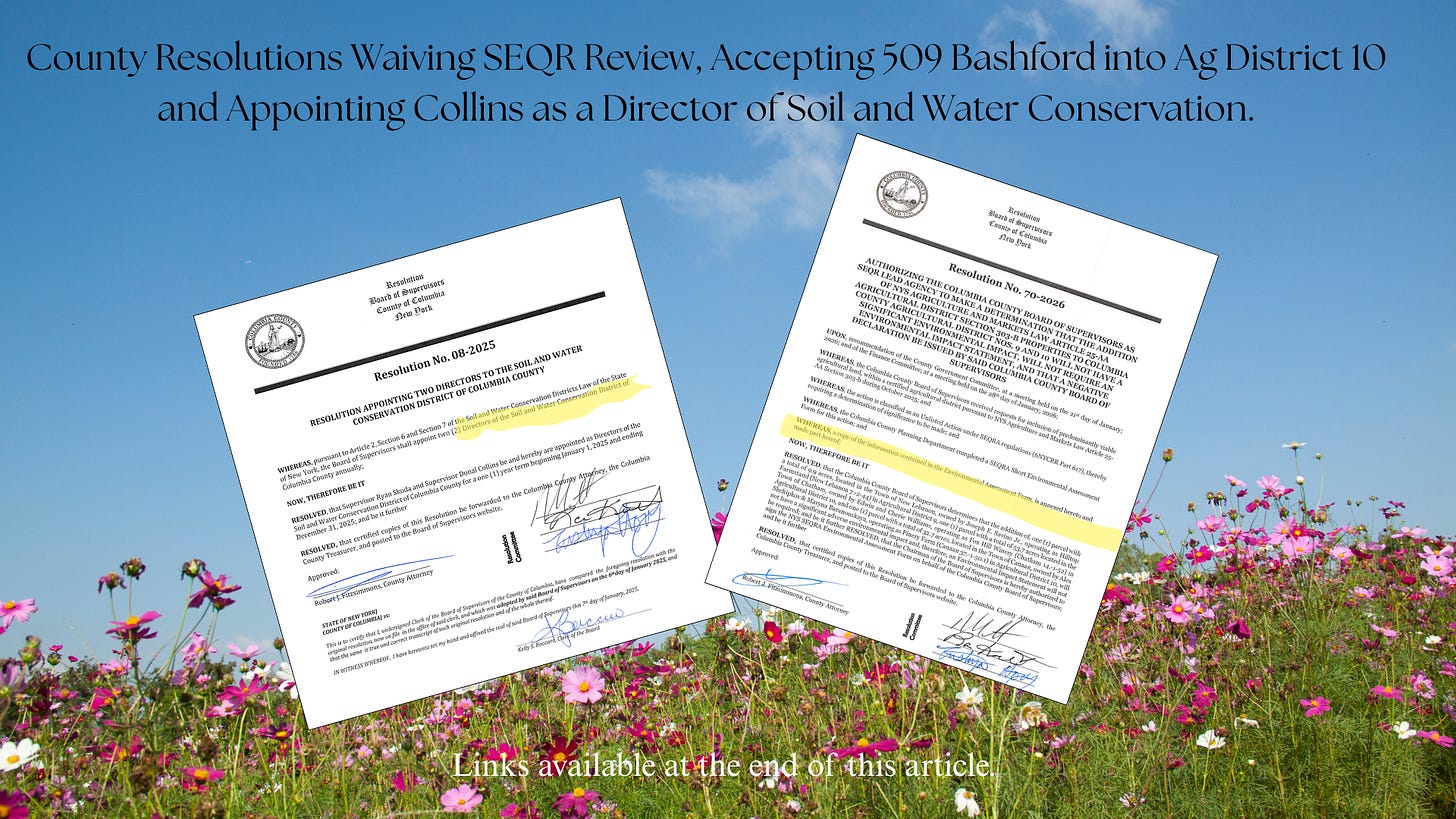 He did not tell the Town Board that the Williams property was moving through the Agriculture and Farmland Protection Board. He did not tell them that County Resolution 70-2026 was naming 509 Bashford Road for inclusion in Ag District 10. And he did not tell them, and this is where it gets sharp, that he remained an active participant in the Columbia County Agriculture and Farmland Protection Board’s (AFPB) deliberations on that very application in November 2025.