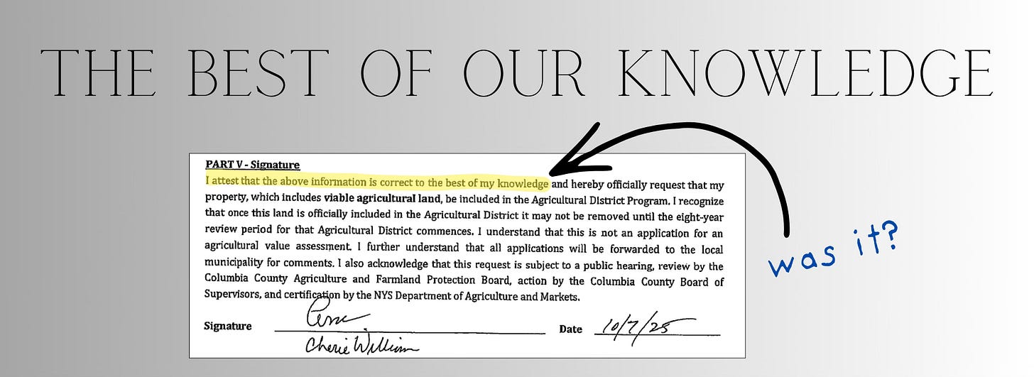When anyone fills out these applications, the person signing their name should be held to a simple notion of truth. Maybe now more than ever in a media desert like Columbia County, where accountability is not a sure thing. Is it really ambiguous to anyone that when they sign an official government form they are legally attesting to the truth? Does anyone really believe, let alone have proof, that Ed and Cherie Williams have cattle grazing on 509 Bashford Road?