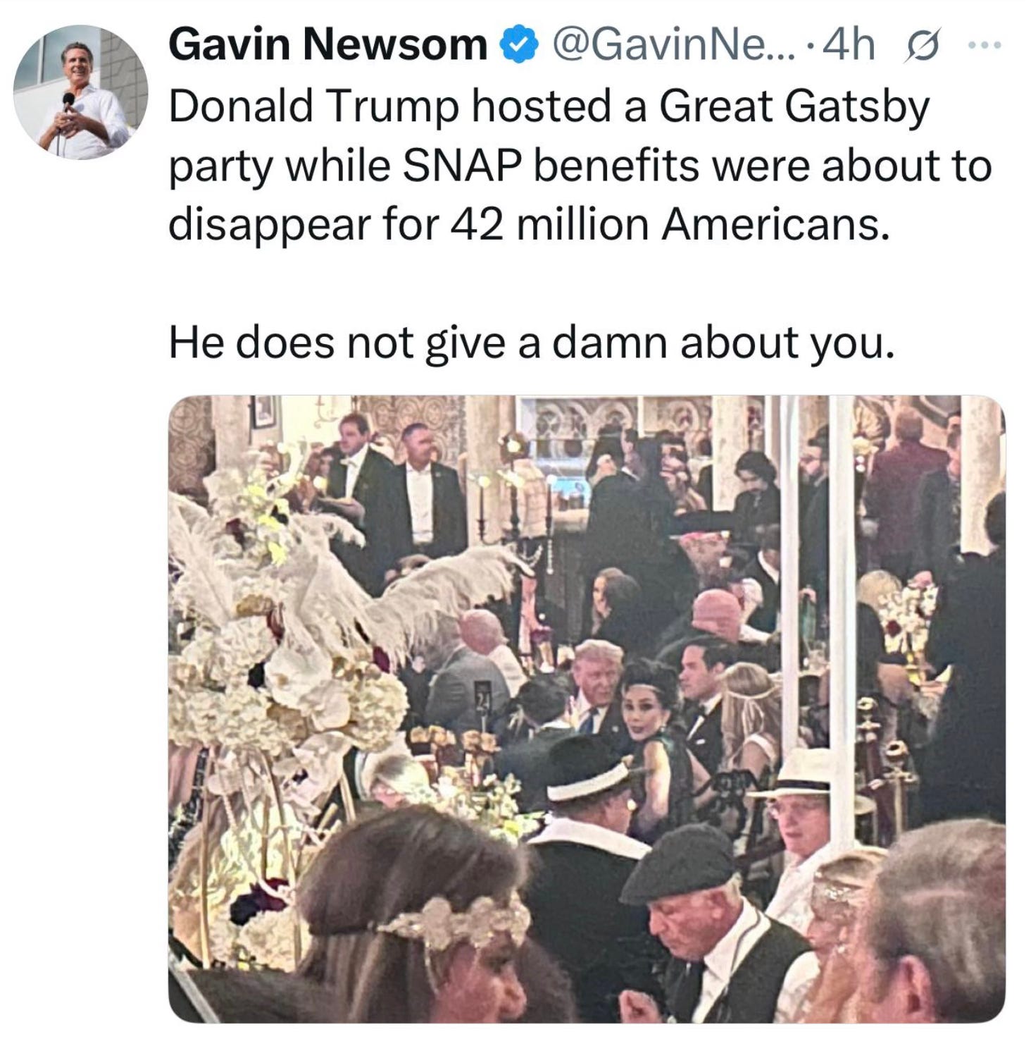 Gavin Newsom — who never met a crisis he couldn’t Instagram — naturally seized the moment with characteristic sanctimony, posting: “Donald Trump hosted a Great Gatsby party while SNAP benefits were about to disappear for 42 million Americans. He does not give a damn about you.” Points for accuracy, if not originality, Governor Hairgel.