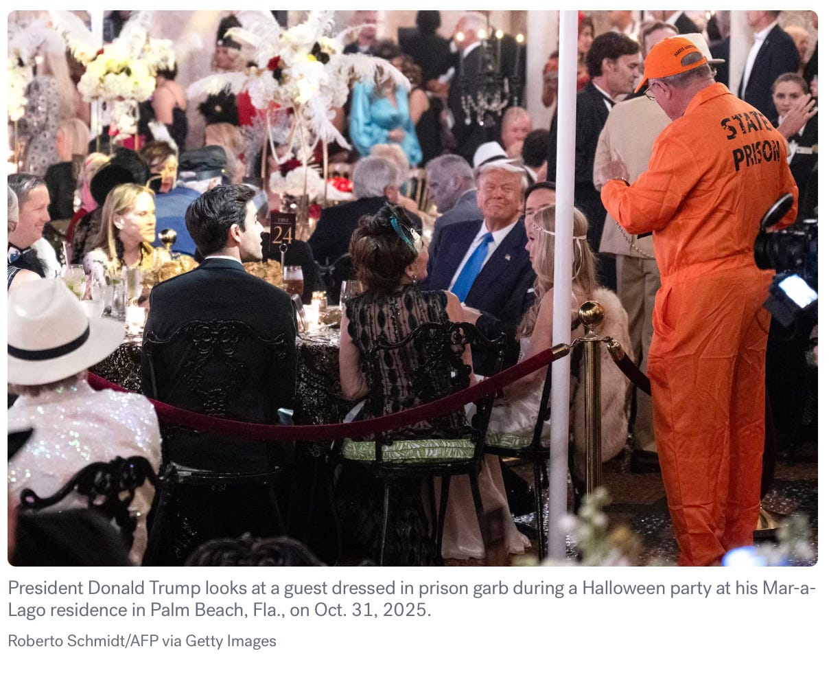 As millions of Americans prepare for a week of no SNAP benefits, rising food prices and no end in site to the government shutdown, Trump held court at his usual banquet table, eschewing costume for his standard uniform of oversized suit and blood-red tie — looking, as one wag put it, “like a maître d’ at his own funeral.” Secretary of State Marco Rubio, that ambitious little weather vane, was spotted deep in conversation with the president, no doubt calculating how many more years of this shit will he have to endure before he just might land in the Oval Office himself.