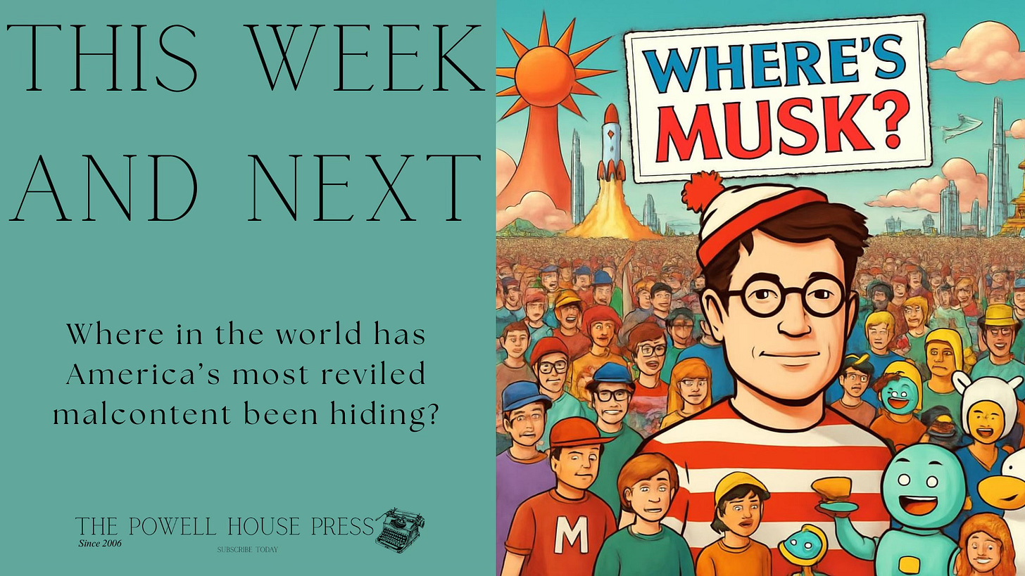 Before I review the week, I’ve been getting a lot of emails wondering why I’m not covering the missing Elon Musk?