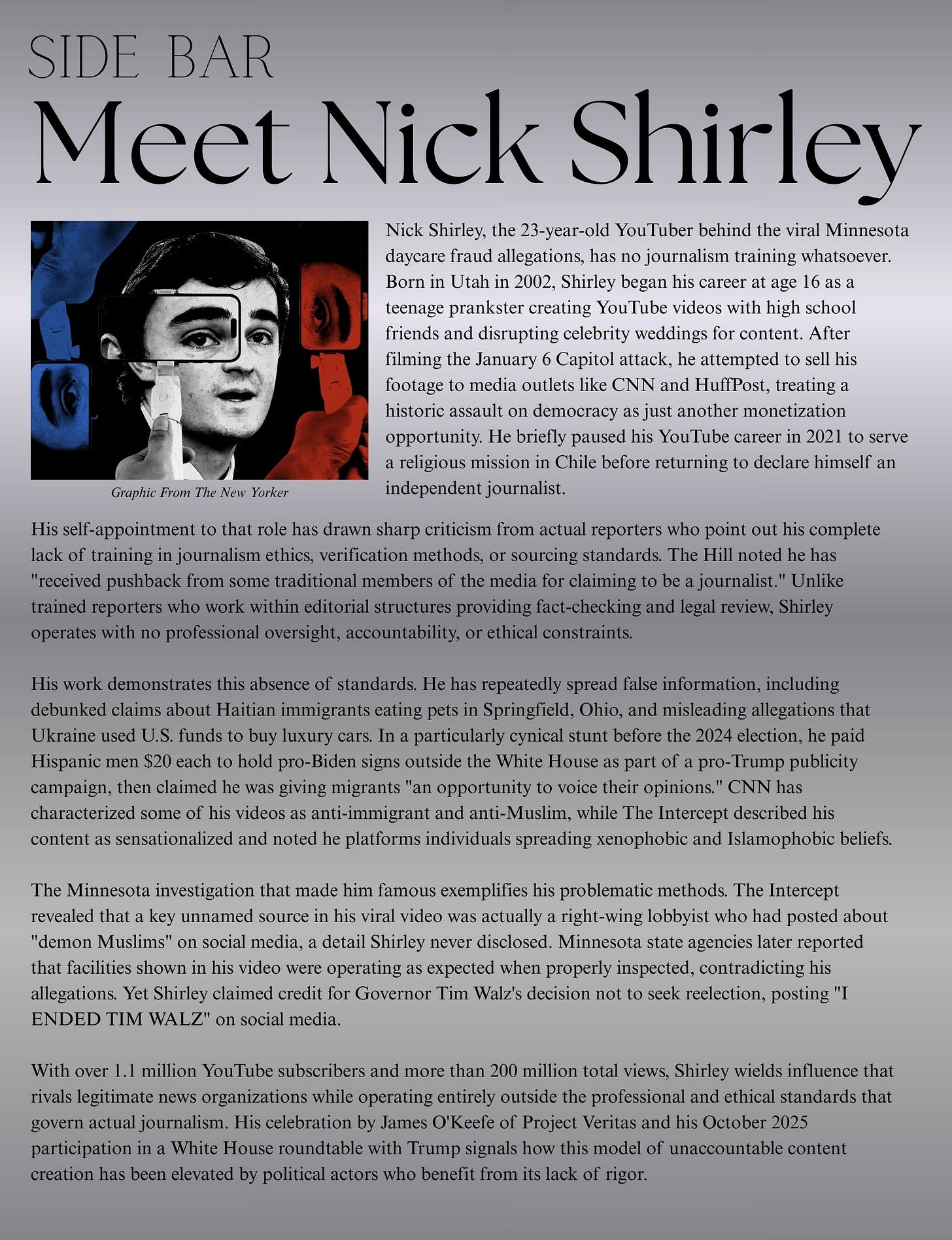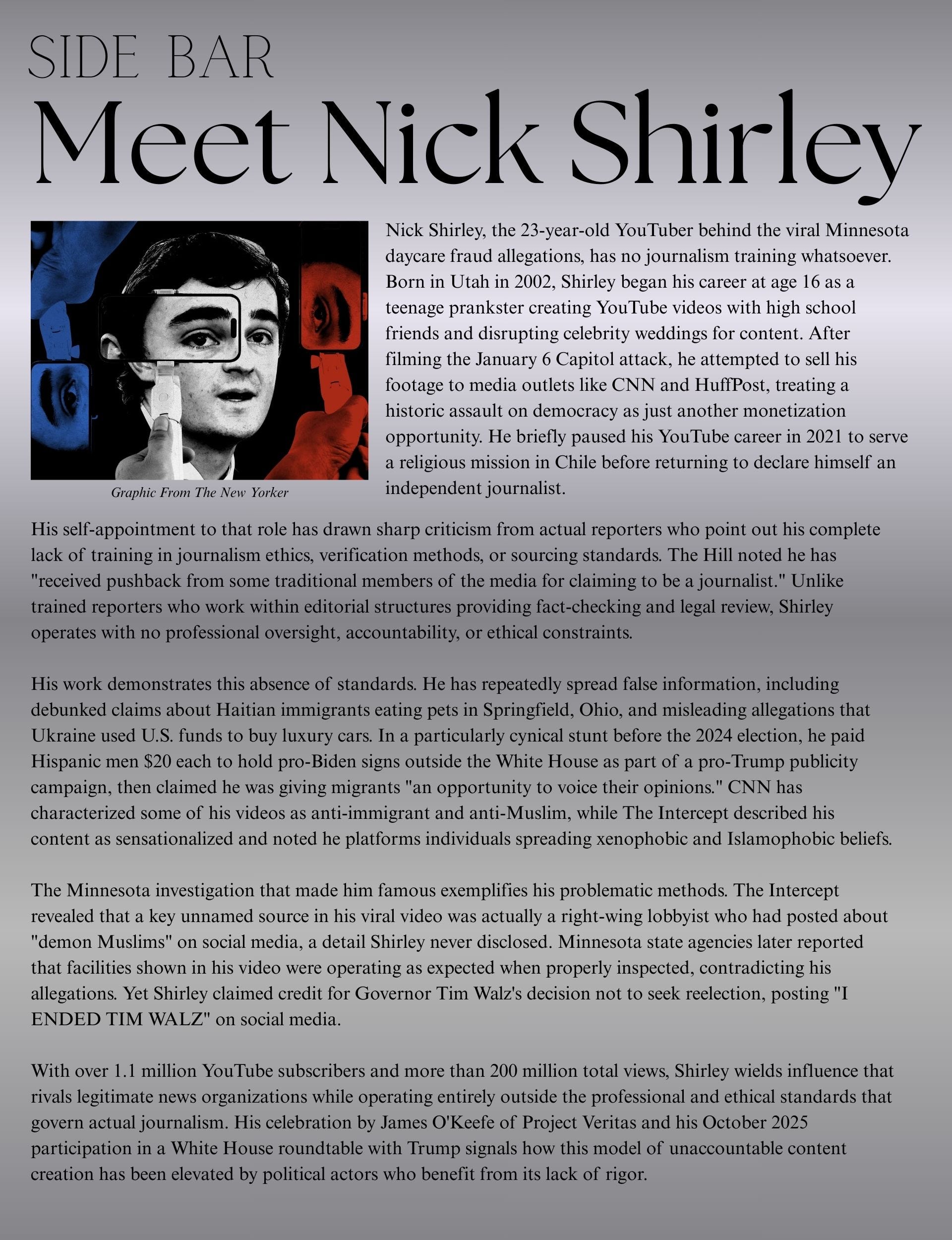 Shirley’s greatest hits include crashing Jake Paul’s wedding and filming himself at the Capitol on January 6. After his Mormon mission, he discovered the MAGA economy rewards racism dressed as journalism. Anti-immigrant content. Anti-Muslim videos. By October, he’s at a White House roundtable calling himself an “independent journalist.”