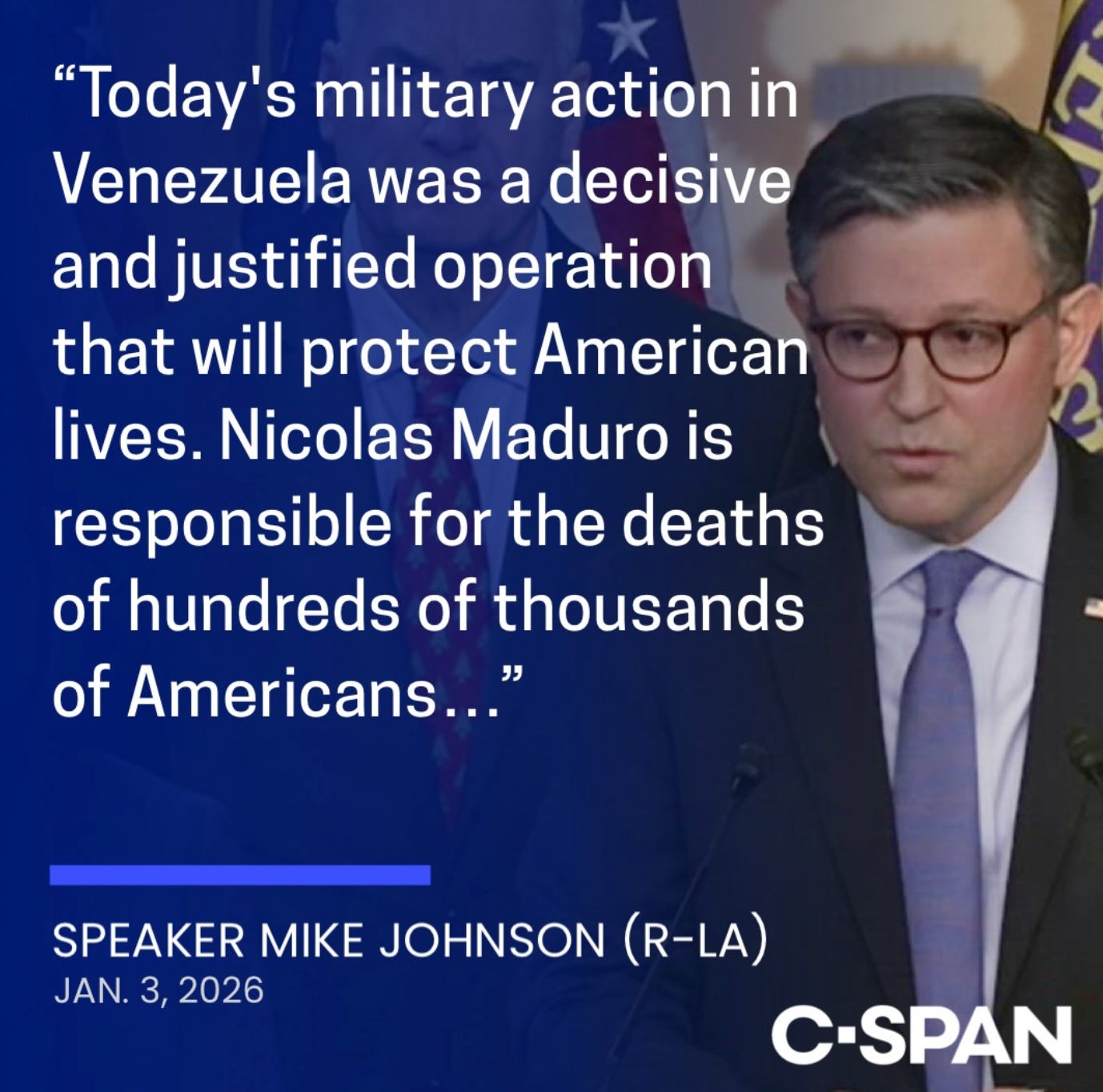 Mike Johnson voted no on both. So did nearly every House Republican. They had the chance to assert Congress’s constitutional war powers. They chose Trump’s imperial presidency instead. And then, shockingly, Trump did exactly what these resolutions were designed to prevent. He invaded Venezuela without congressional authorization, without advance notice, without any pretense of constitutional process. Who could have possibly predicted this?
